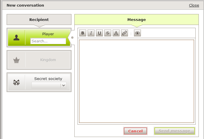 Linke Spalte: Liste der Unterhaltungen, Spieler suchen oder Nachrichten an dein Königreich (wenn du die Rechte hast) oder deine Geheimgesellschaft schicken.