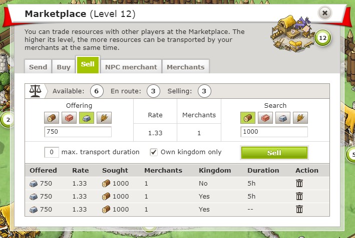 ![]() Du kannst deine Rohstoffe auf der Registerkarte „Verkaufen“ sehen. Hier kannst du deine eigenen Angebote einstellen und darauf warten, dass sie von anderen Spielern angenommen werden. |