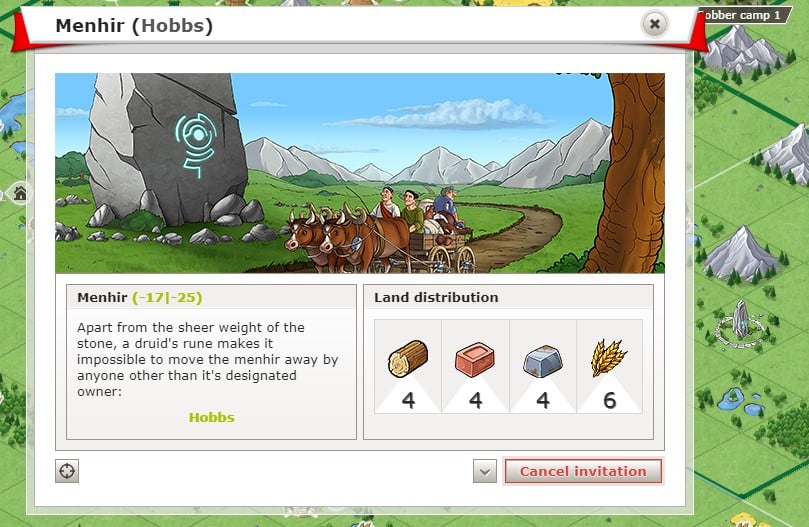 | To remove a menhir and cancel its associated invitation: Click on the menhir on the map. Select the magnifying glass icon from the circular menu. Click to cancel the invitation in the detailed view.