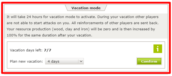 Vacation Mode lets you pause your game when you need time away. Your villages are protected, but your account also has restrictions.
