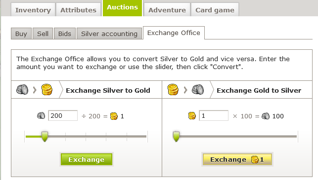 The Exchange Office lets you convert between Gold and Silver. The exchange is instant, and the new currency is available right away.