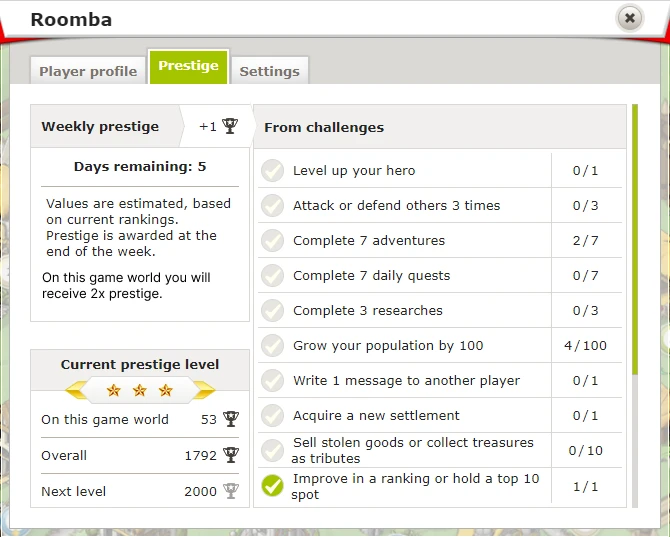 Ces efforts peuvent rapporter jusqu'à 50 points de base de Prestige par semaine, avec des bonus supplémentaires pour les 10 premiers classés dans les classements clés. Et n'oublie pas : si un monde de jeu se termine en milieu de semaine, les honneurs que tu as gagnés sont enregistrés tout de suite, pour que tes exploits soient reconnus.