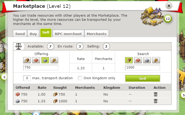 Quand tu mets une offre de vente, les ressources proposées sont retirées du Dépôt/Silo et mises sur la Place du marché. Les ressources sur la Place du marché sont aussi protégées contre les pillages ou les attaques des autres joueurs.