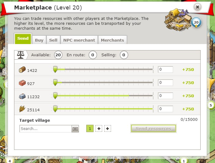 ![]() Tu peux envoyer des ressources à d'autres joueurs si t'as assez de marchands disponibles. Tu peux voir combien de marchands tu peux utiliser et combien sont déjà en route ou réservés parce qu'ils vendent des ressources. Sur la capture d'écran, tu peux voir que 20 marchands sont disponibles sur la Place du marché. |
