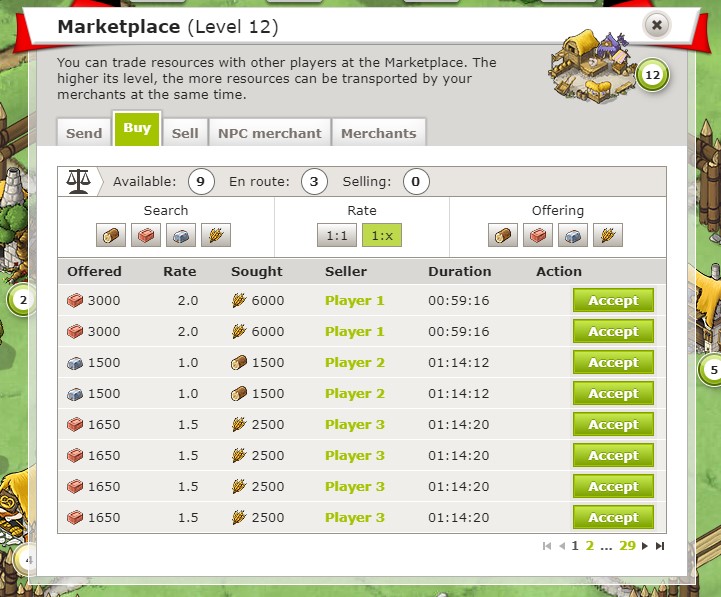 ![]() Tu peux acheter des ressources à d'autres joueurs depuis l'onglet « Acheter » du Marché, où tu peux voir toutes les offres disponibles en ce moment. |