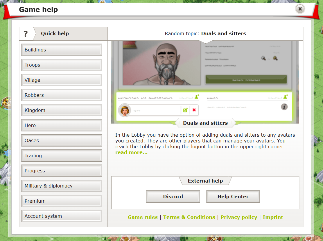 Travian Kingdoms, Yardım Merkezi, Discord ve Hızlı yardım dahil olmak üzere çeşitli yardım alma yolları sunar.