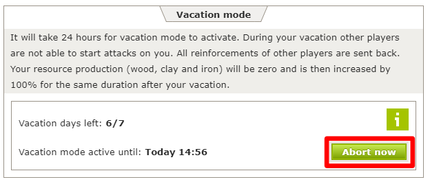 Güçlendirmeler: Hammadde Bonusu tatil sırasında duraklatılır; kalan süre tatil sonrasında devam eder. Travian Plus ve Tahıl Bonusu normal şekilde devam eder.