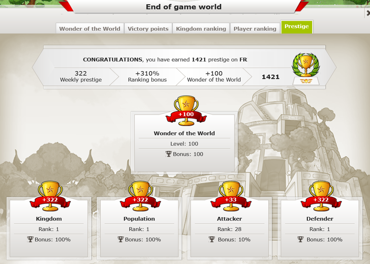 Travian Kingdoms'ta, bir Dünya Harikası 100. seviyeye ulaştığında tur sona erer.
